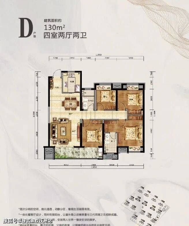 D户型建面约130㎡,四室两厅两卫:该户型位于边户,也是三开间朝南,南北通透,但该户型南向面宽更宽,采光更好,私密性也更加;出阳台外,三间卧室均有飘窗,可以优化面积多。不过过道比较长,有点浪费面积。