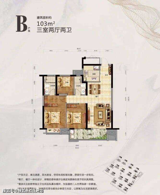 B户型建面约103㎡,三室两厅两卫:该户型位于中间户,与上面109㎡户型基本一样。