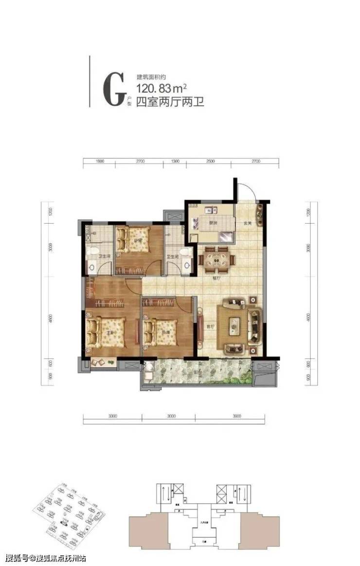 G户型建面约120.83平,三室两厅两卫:此户型位于边户,南北通透,非常方正,和上个户型的布局很一致,不过这是边户。这个户型图上写的四室,但实际应该是三房。