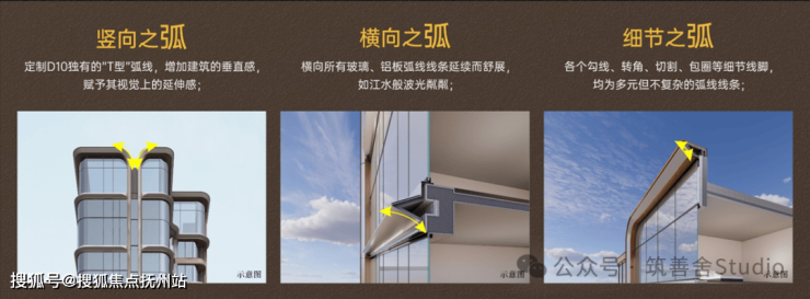 以豪宅立面划定身份,D10天誉摒弃了传统立面的“棱角分明”,遵循斐波那契螺旋系数,以无限的美和艺术,形成了一整套的曲线外立面体系。曲线大胆流畅而且随性,塑造出种难以想象的未来感,整体外观看上去更加圆润柔美,在高楼林立的城市中脱颖而出,将D10和其他住宅区分开来。并打破了市面上常规的门窗分隔,大比重选用玻璃+铝板线条,将视觉界面拓展到「270°全画幅」,使室外景观以超广视角进入室内空间,打造“天空客厅”般的感受。