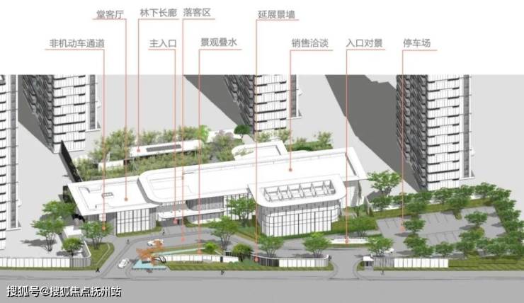 酒店式主入口建筑形态取自于江南特色荷田意向,屋檐之间形成高低错落之感,宛若张大千《荷堵野趣》画中葱郁的荷田之景。建筑中主要的材料有赤陶和铝板两种,一浅一深,一种温润如玉,一种沉稳厚重,形成鲜明的对比碰撞。