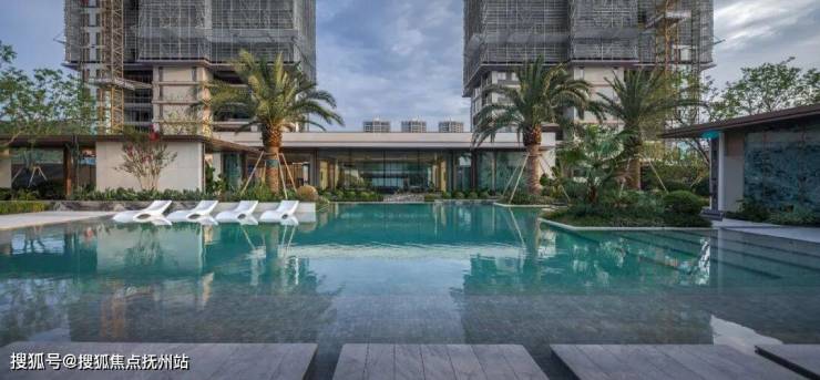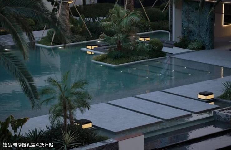浅蓝色的池面随风轻轻摆动,宛如一幅动人的画卷,让人心旷神怡;潺潺的流水声,如同天籁之音,为这片空间增添了几分灵动与生机;六颗挺拔的海枣树,更是以其独特的热带风情,为整个空间带来了一份热烈与活力。