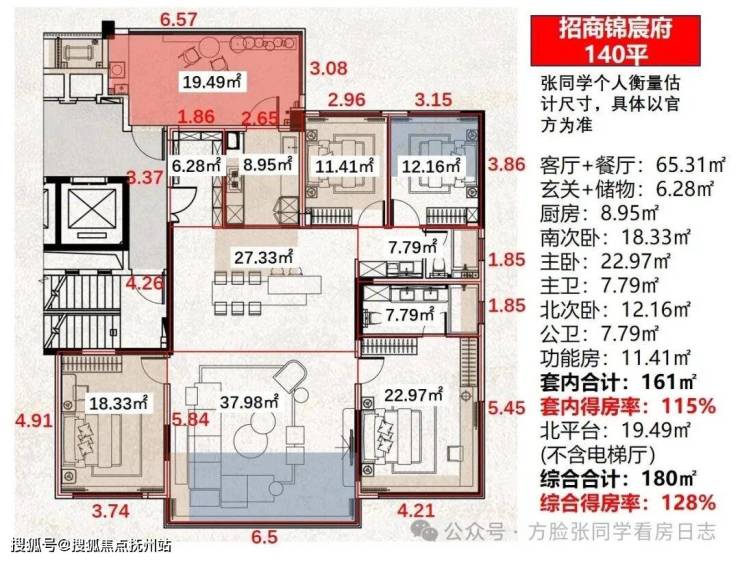140平户型实得180平、得房率128%