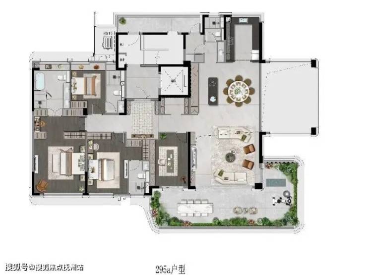 平层户型核心优势:项目摒弃了传统大平层仅在南向设置阳台的常规做法,进行了革命性的空间重组。将客厅、家庭厅等核心功能区布置于楼栋的端头或转角位置,实现了主要生活空间至少两面甚至三面的采光与视野。巨幅落地推拉窗彻底打开后,整个厅堂与露台融为一体,光线与风景毫无阻隔地涌入室内。