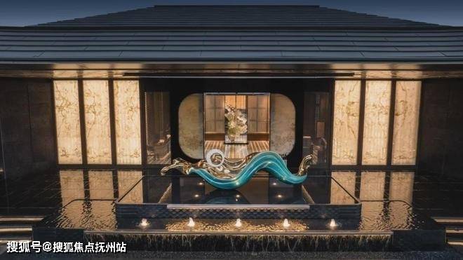 叠级水景中心放置龙形曲线结合龙鳞元素艺术主题雕塑,雕塑上,一轮圆月刻画的圆润光泽,迎龙之形,观月之意,刻画了迎龙观月独一无二的门厅礼制和归家仪式感。