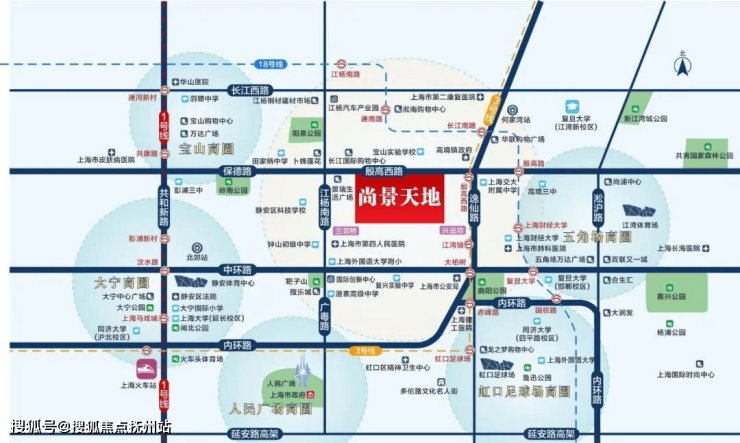 【尚景天地】隶属高境板块,地处杨浦、静安、宝山、虹口四区交界的位置。配套成熟、生活便利、公共交通四通八达,地理位置优越。项目对面自带大型商业综合体长江国际购物中心,附近还有三邻桥、新业坊这样的新兴商圈,完全可以满足业主平日吃喝玩乐一站式的休闲娱乐体验感与基本的日常生活所需。
