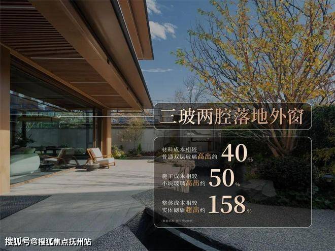三玻两腔大落地窗整体成本比实体砌墙增加约158%,带来的是保温性能和瞰景视野的大幅提升,实现了室内与室外、居者与景观、建筑与园林的最大互动相融,外立面风格亦愈发简洁自然。(数据来源:施工单位询价)
