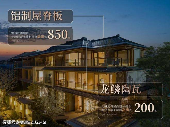 中式建筑的斜屋面,在一定程度上传承了中国人骨子里的情怀与审美。建澜府排屋斜屋面,使用当代菱形陶瓦进行龙鳞状铺设,实现瓦面根据屋面走势转折和立体包裹,整体成本较普通平屋面高出约200%。铝制屋脊板为龙鳞瓦规整序列和层次,相较普通混凝土屋脊涂料成本增加约8.5倍,最终形成硬朗且纤细、厚重且规整的屋面效果。(数据来源:施工单位询价)