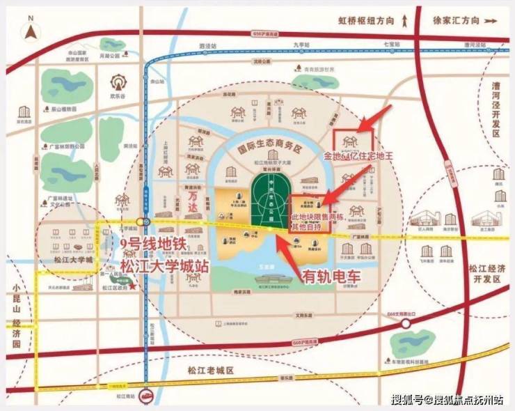 G60科创走廊打造一廊九区的分布:松江新城作为国际生态商务区总部的研发功能区,未来引入的都是高收入高学历高精尖人才,必定会带来巨大的居住的需求,项目的东侧一公里是政府斥巨资以地标来打造的双子大楼,未来板块的价值不可估量
