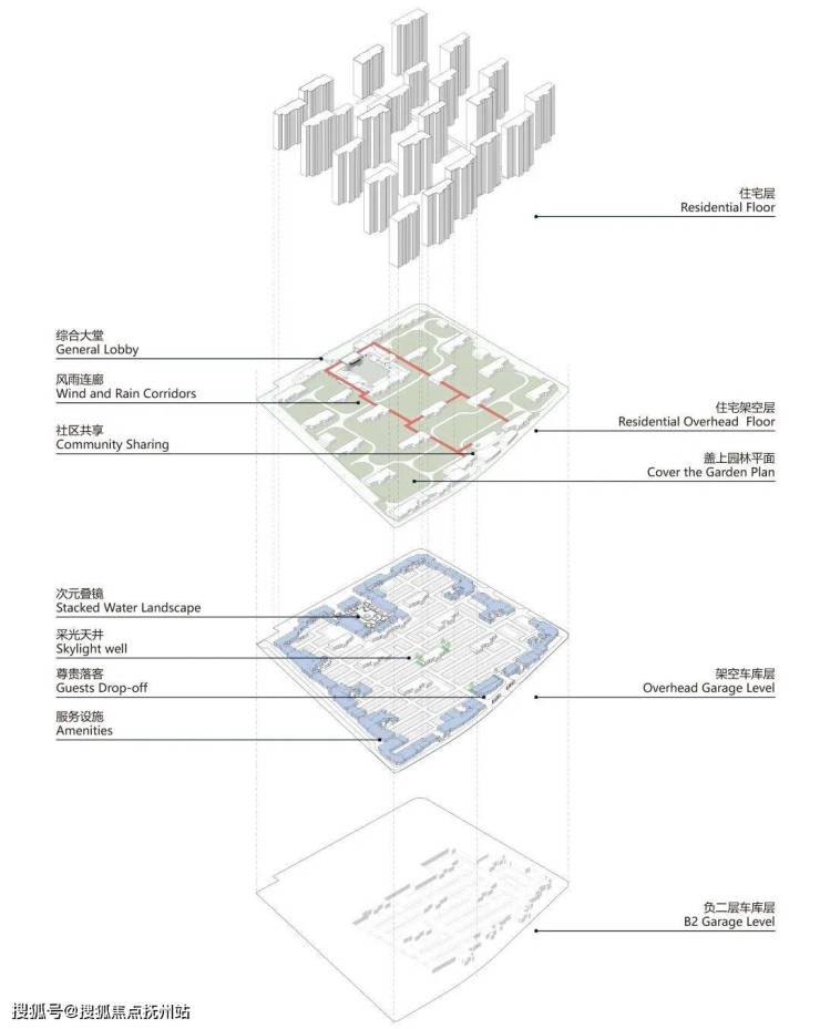 为彻底消融城市与社区的界限,项目以“超级底盘”重构社区基座。通过抬高地库、整合车站与商业配套,将地下空间转化为多功能垂直枢纽。