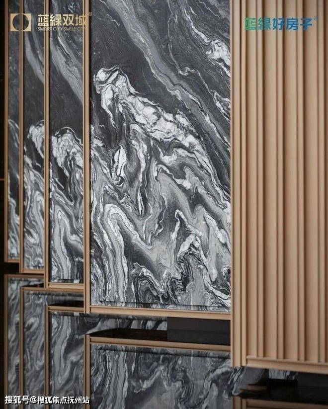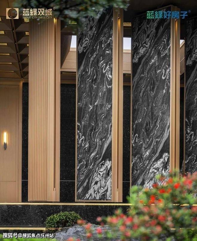 大面积、多场景使用进口幻影蓝&紫山水奢石,从两大主入口到叠墅区连廊墙面的装饰,不惜工艺的繁复以求弥合生活的预期。