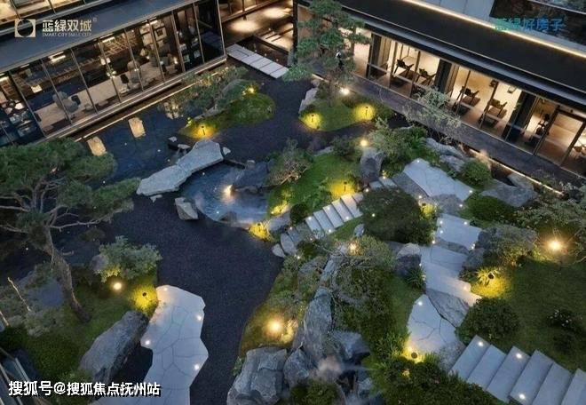 为了让《千里江山图》中的远方和诗意落户园区,江山宸庐用心还原“山海苍南”的山水感和“无尽蓝绿”的原野感。其中跋涉千里运来黑原石,只取阳光风雨沉淀后的成熟石皮,个头大的落位于下沉式庭院的叠山和转弯抹角处的布景,个头小的则星罗棋布于园林树荫、商业街区,苛求原生态造景;上面覆以鲜活的苔藓,点缀景观的层次和生活的味道。
