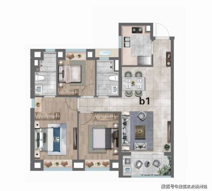 该户型附加空间很足,四口之家或是三代同堂都有非常好的居住体验。