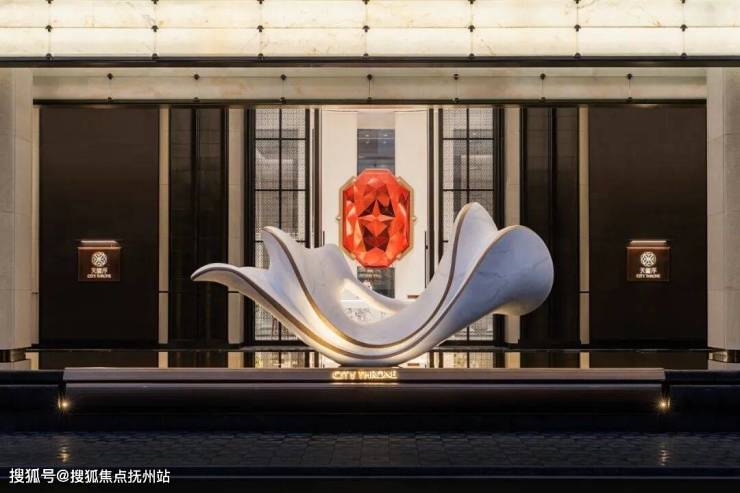 打开贝母流光和铜质相映的非遗锤纹大门,步入7米挑高的入园大堂,绸缎般的弧型石材在墙面一以贯之地延伸进来,前台对景,一颗色泽温润的红宝石在浅色系大背景中“跳入眼帘”: