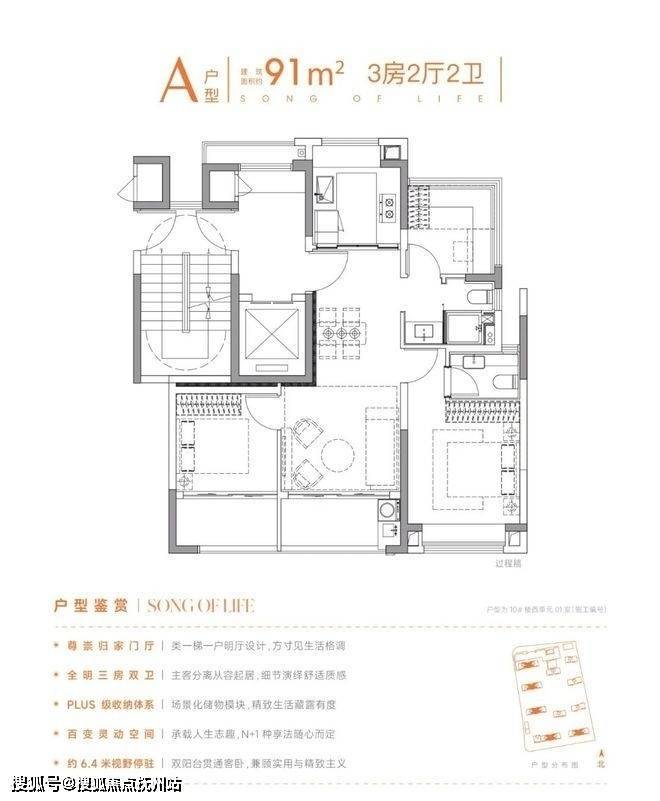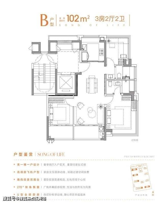 高得房率的飞机户型减少过道浪费,餐厅空间比同面积段户型更阔绰,家庭聚餐更显从容;双卫均带飘窗,洗漱时也能沐浴阳光;南北双270°环幕视野,通风采光俱佳,适合追求生活品质的年轻改善家庭。