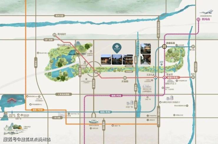 交通上,三轨交汇(地铁 3/6/9 号线),双高架联动,济南东站国家级枢纽辐射,畅达全城;