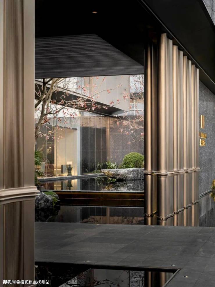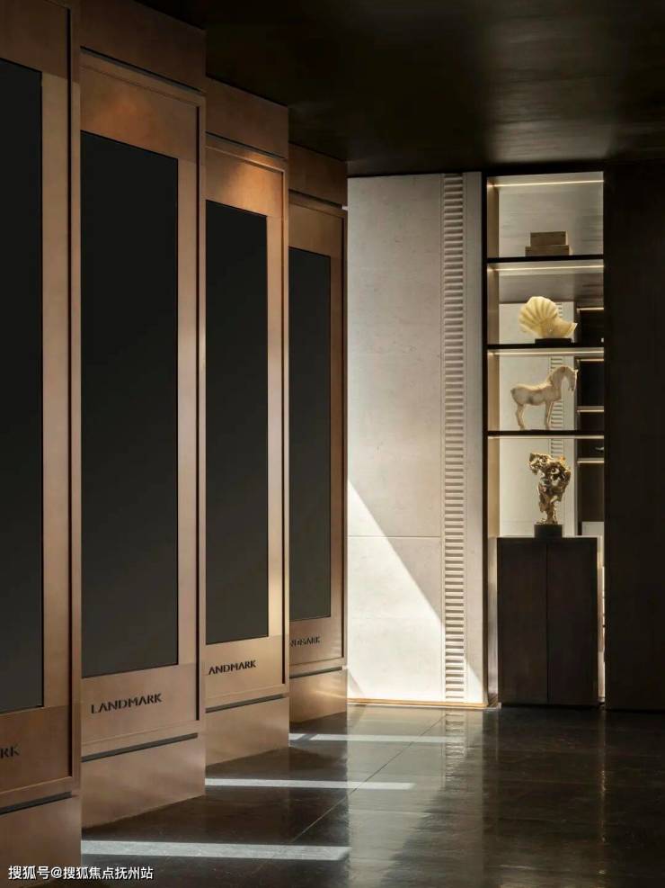 利用现代科技LED艺术装置背景,作为可变空间元素,将江南园林及苏州在地性文化融入其中,并随时变换。墙面通过深色木化作中式花窗格。大门采用厚铜门,表现出江南大宅的门厅感受,迎接客人到来。