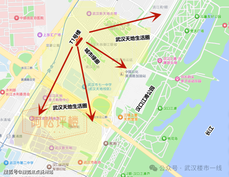 它的东南向即是延绵到汉口江滩的城市绿廊,西边即高低错落的社区中央园林,北向即市政公园(部分在建),毫不夸张的说,T1号楼东、西、北几乎被绿色环抱,在城市核心享真正的低密、松弛生活。