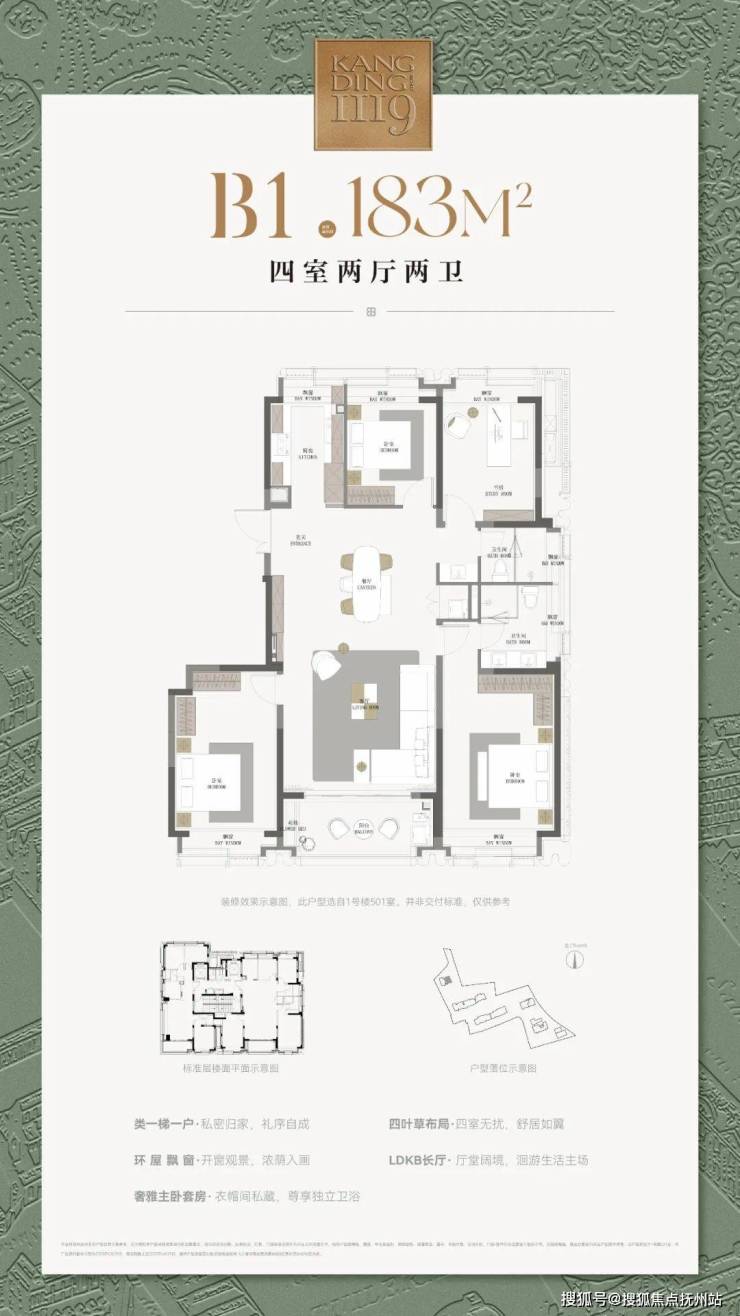 建筑面积约183㎡户型,类一梯一户设计,电梯厅私密入户,无需路过/被路过同层邻居家门,尊享悦己的静谧;