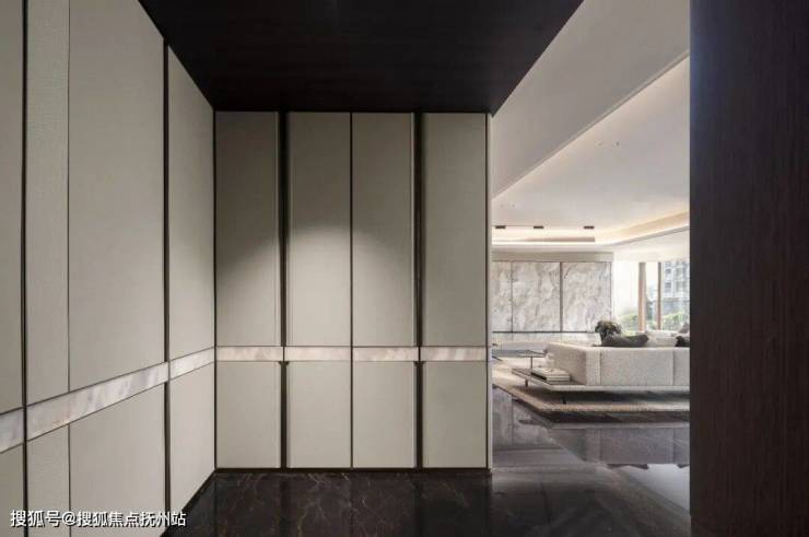 令人印象深刻的,是艺术玄关链接客厅公区的那道 “腰线”—— 内嵌于玉石之中,呼吸之间闪烁着柔和的氛围灯光晕,仿佛在亲切欢迎你的归家。