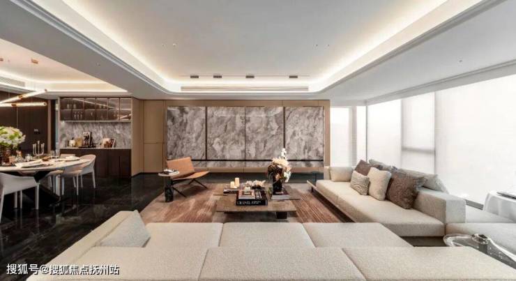 还有许多极致的工艺细节,比如弧形元素的贯穿,客厅天花板造型采用大仰角的弧形线条,舒展空间的视觉流动;餐客厅公区墙体设计了大量的弧面与凹槽处理,柔和线条艺术般流淌;餐厅木饰面横向、竖向纹理穿插交互,加之弧形凹槽中点缀的氛围灯,形成连贯的设计韵律,彰显个性审美与精湛工艺。
