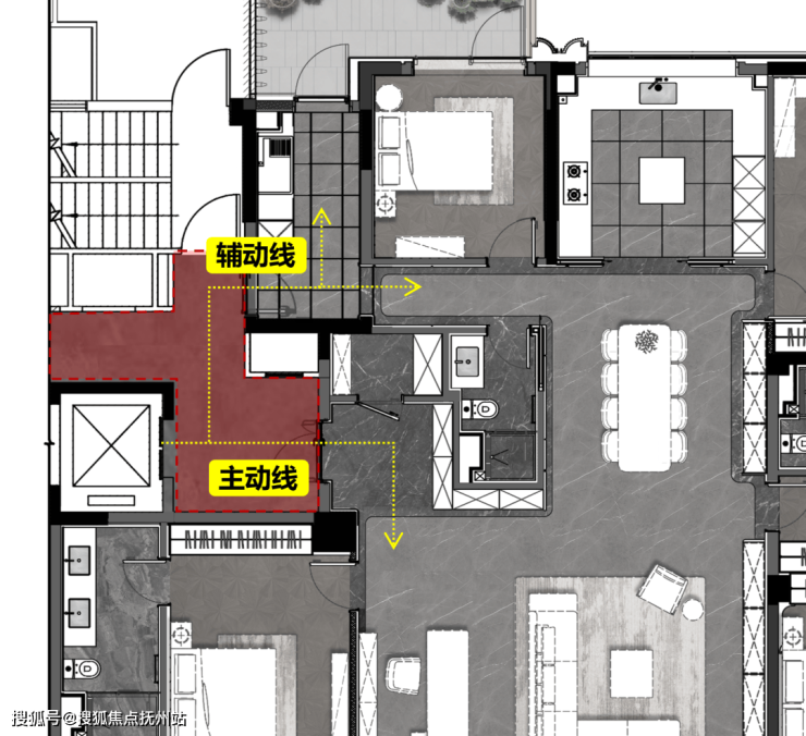 从数字上看,是不是不可置信?一套256㎡的房子在四套房的骨骼外,居然还能有这么大的公区尺度?