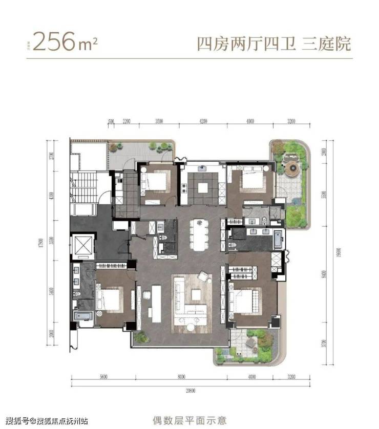 这就是“超四代宅”的颠覆手笔,搭配赠送的合计约70㎡的阳台与空中庭院,它的格局气场已然超越了市场上常规300㎡级大平层。