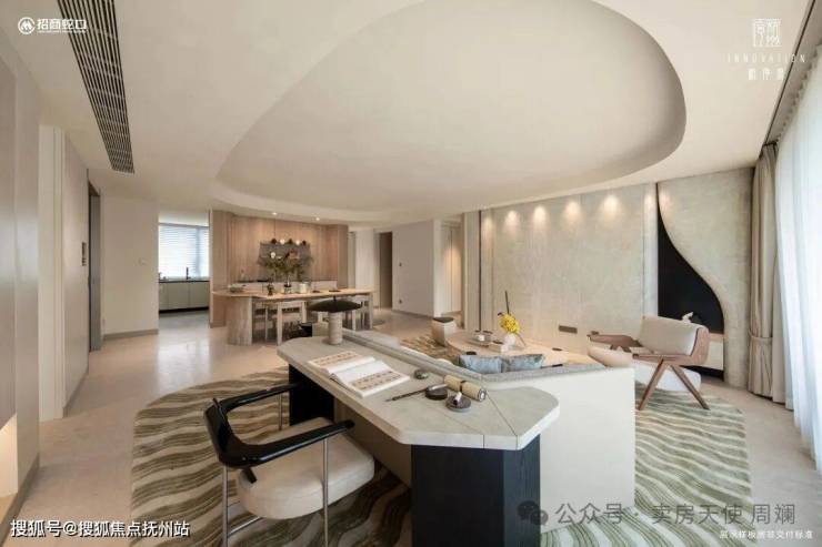 【陶砚176】取陶砚之自然璞实感,雕琢白冰玉的背景墙,客厅吊顶还原砚台造型,室内饰以瘦金体笔划装饰线条。