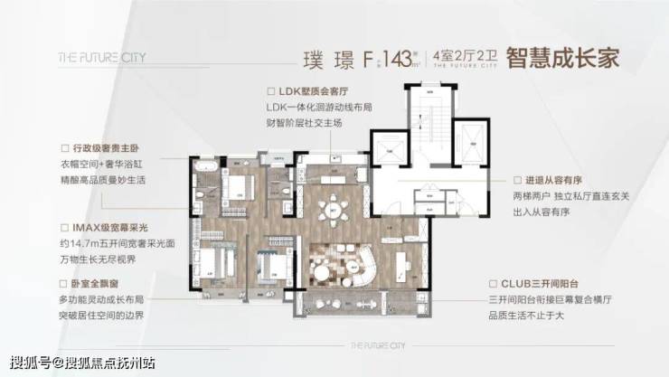 再看看建面约143㎡的洋房户型,则又让整个空间尺度有了更大的提升,采用了四房设计,增加户型的实用性。