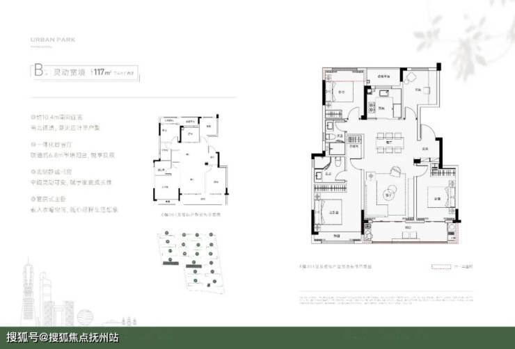 如果预算允许,可以直接117方四房改善。建面约117方四房两厅两卫户型,为标准的四叶草布局,空间尺度更为阔绰。三开间朝南面宽达到了约10.4米,客厅与次卧贯通的长阳台近6.8米长,不仅通风采光更好,也为晾晒、花草养护等提供了更多的生活情趣。
