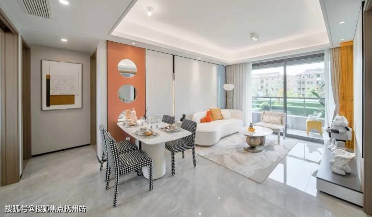 一体化餐客通厅,连接盛景阳台,闲暇时,孩子在客厅弹奏钢琴,父母在厨房准备晚餐、老人在阳台莳花弄草,置身不同空间,家人却可以视线相交、亲密交谈。