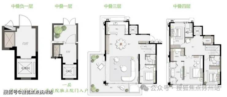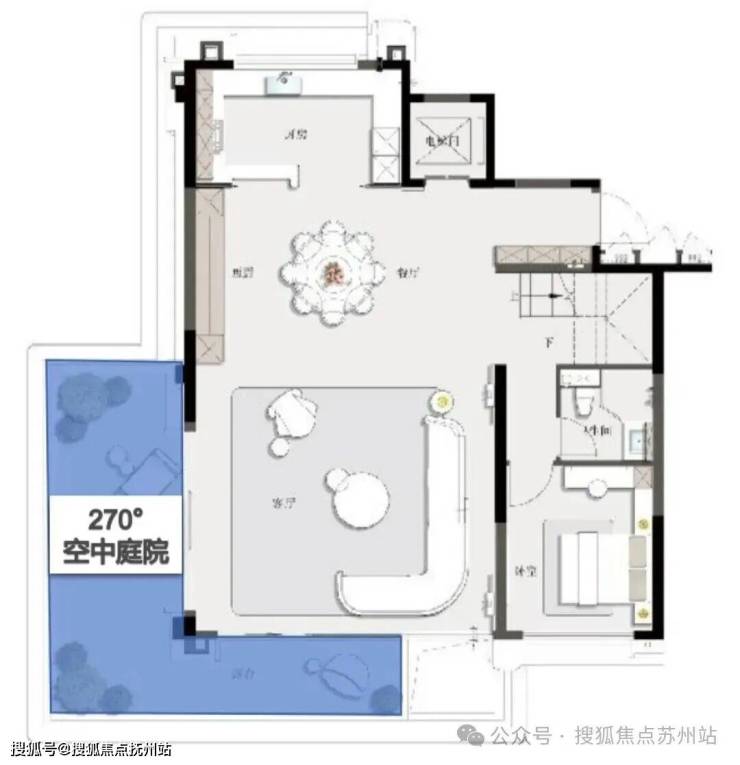 该户型打破 “中叠无庭院” 的固有认知,在首层就配置了270° 空中庭院。
