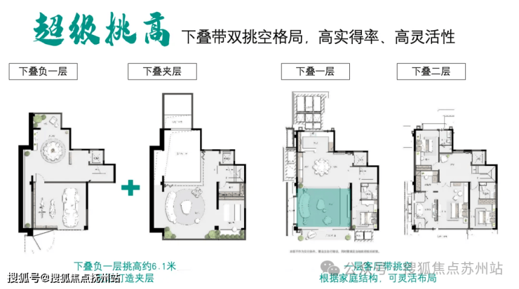 区域内首创地下室6.1米挑高:地下夹层自此不再压抑,同步4个采光井设计,无需为采光通风问题担忧,让地下室真正成为生活功能空间。