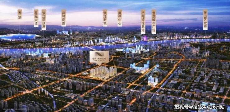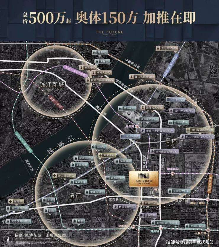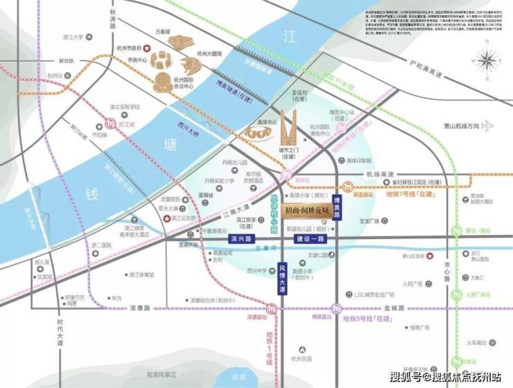 项目地处博奥路与建设一路交叉口, 西靠滨江区,北接奥体,南邻萧山区,可谓是三核共融之地。项目周边环绕了 1号、5号、7号三条地铁线,其中最近的 7号线明星路站(在建)直线距离在1公里左右。