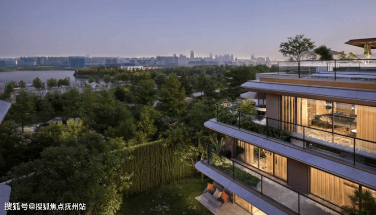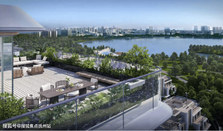 超级流体立面系统采用铝板与玻璃幕墙的现代组合,南北分置形成"跑道式"超长露台庭院;超级湖景全景舱概念在建面约400㎡顶复户型中体现得最为极致,通过约6.5米挑空巨厅与三个全部朝湖的露台组合,形成如游艇甲板般的生活体验。