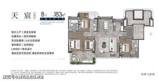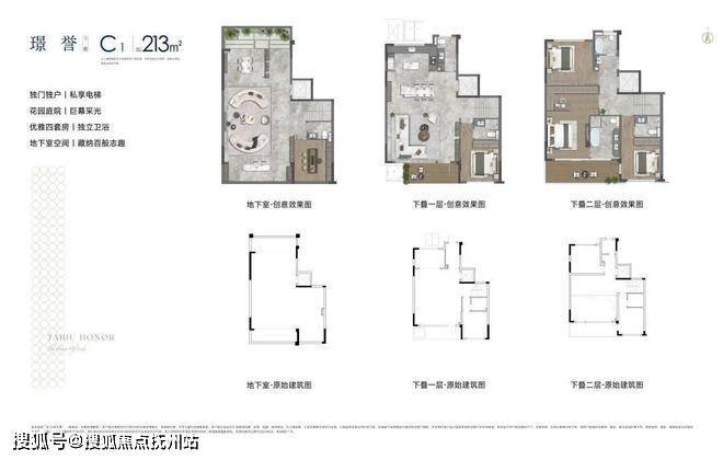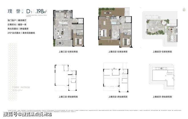 四代洋房户型151-183㎡,户户花园,空中庭院,南北阳台+露台;上叠建面约198㎡、下叠建面约213㎡;