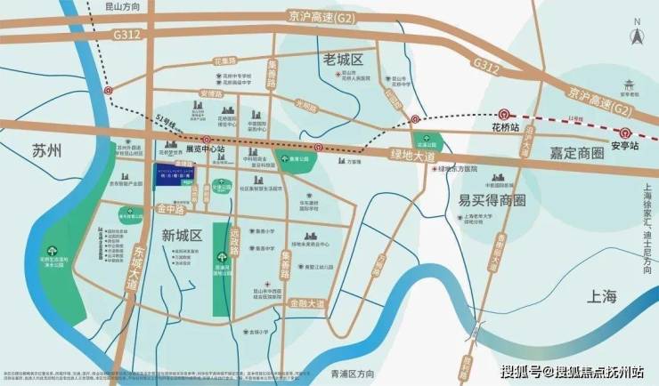 项目位于昆山花桥,说起花桥相比大家都非常熟悉了,它直接与上海嘉定、青浦接壤,与嘉定的安亭仅一路之隔,从地图上看宛如“嵌”在上海。