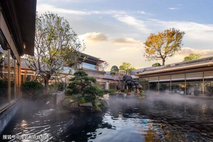 循着动线深入,近1000方下沉式飞瀑庭院铺展眼前,将瓯江山水凝萃这方寸院落之间。双重飞檐的听泉亭,飞瀑倾泻而下,映月桥如弯月横卧,穿林石阶寓意步步高升,处处皆是景致。
