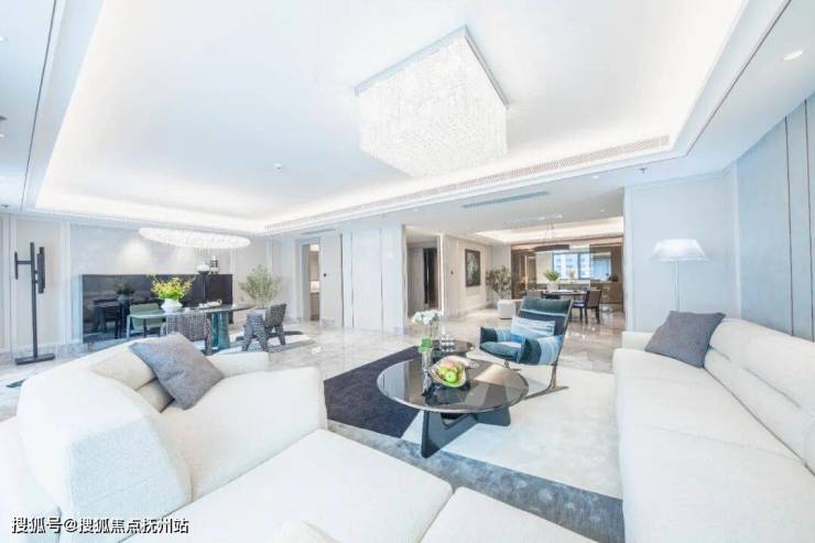 走进家门,玄关处一整块卡里冰玉石材的应用让珍贵和奢华气质扑面而来。 开间约9.35米的超大视野横厅,可灵活呈现丰富多元的生活场景。这里可以是全家欢聚一堂的客厅,是主人修心养性的茶室,是孩子自在玩耍的空间,是老人修养身心的天地,空间足够宽敞,即使是容纳20人的家庭聚会或友人PARTY也绰绰有余。