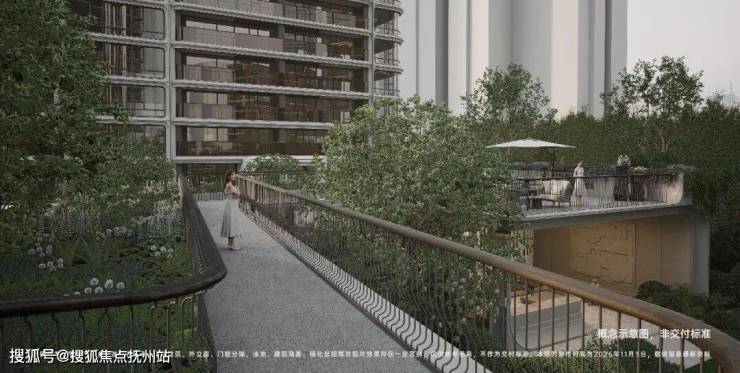 一层与架空层功能融合,贯通儿童乐园、主题花园等,是可以近距离观赏二十四节气植物的归家路线;二层则串联双层会所空间与风景漫游道,既能晨走、慢跑、散步,也适合遛娃、遛狗与轻社交,并且多了一个树梢高度的观景平台,近观中央草坪,远观滨江中央公园。局部下沉式景观设计,实现“一步一景”,营造立体游园的层次美学。