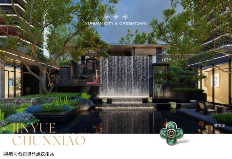 约330㎡的下沉式水院空间内,一座流光悬瀑,仿若梦幻之水自高处倾泻而下,设计精妙绝伦,布局高雅大气。