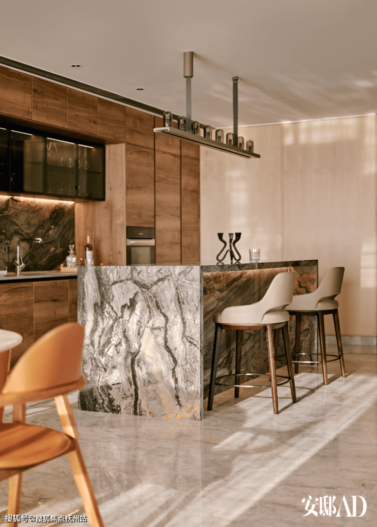开放式西厨居于餐厅一侧,不管享用早餐,还是邀请朋好友小酌,都是放松而富有仪式感的日常画面。
