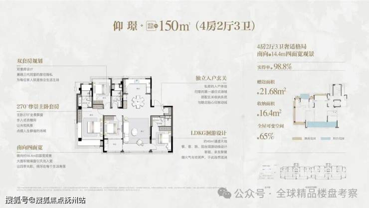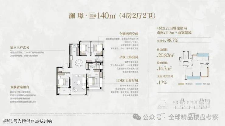 五厅格局创新:以近7米面宽横厅为核心,衔接约40㎡南向庭院,创造性地实现社交、休闲、娱乐的功能分离。