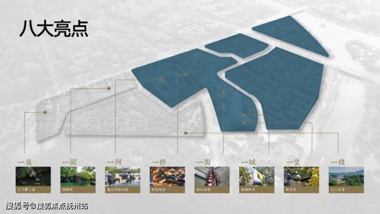 一泉:天下第二泉;一园:寄畅园;一河:龙头河惠山浜;一桥:时空乐廊;一街:乐宴长街;一域:百相映月;一堂:映月堂;一线:云上惠音。