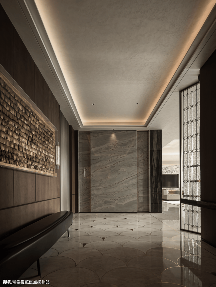 建面约 560㎡「归逸」重塑居住的精神维度,即空间不仅是物理尺度的延展,更是居住本质的一场深度探索。约8米进深的会客厅地面通铺珍贵石材,客厅背景墙选用意大利fendi白石材,大尺寸面积铺设石材纹路都做到完美拼接,如同一卷徐徐展开的绢本。