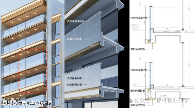 在细节的把控上,竖向构件项目采用了梭形的截面形式,结合端头的型材与侧向铝板,让建筑形体更加挺拔,阳台部分则采用宽窄两种细部截面处理,搭配灰色玻璃栏板,两层一组,去弱化阳台的体量感。飘窗部分也是两层一组,宽窄相间的截面处理,弱化飘窗在纵向上形成的体量感。