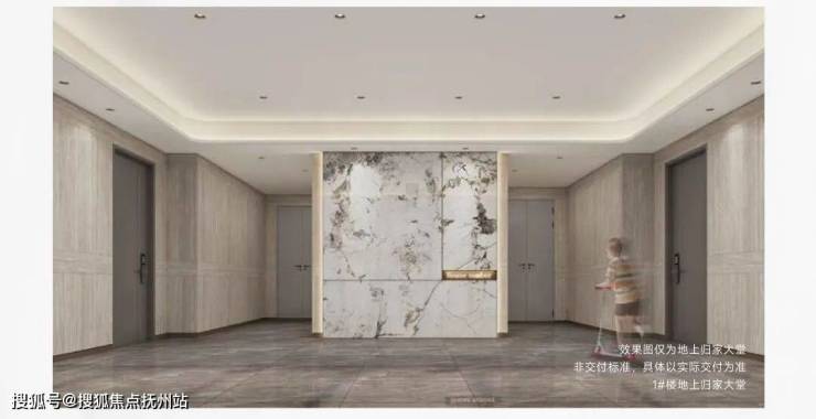 注重归家的仪式感,更重视心灵的归藏,奢装地上入户大堂,公区墙面地面均采用仿石材墙砖,大堂主背景采用仿石材岩板,搭配古铜色不锈钢踢脚线收口线,营造尊崇的入户体验,彰显奢宅生活主张。