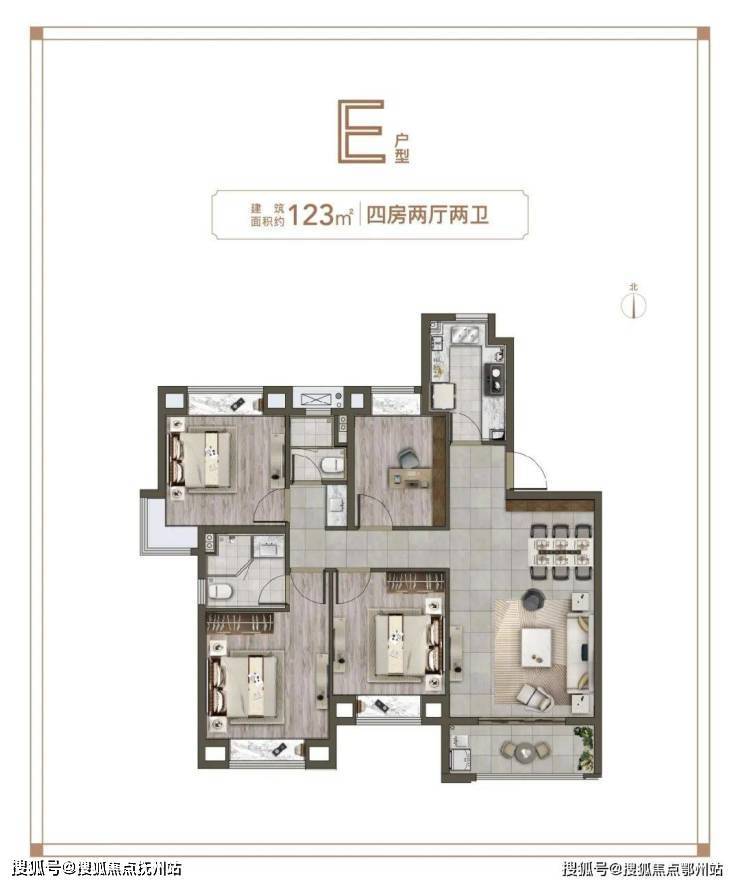 其它的像三开间朝南、全卧飘窗、主卧套房、厨房敞口开阔等,这个户型都做到了。
