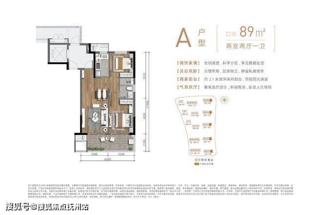 建面约89m²的户型设计了两房两厅一卫,面积虽不大,但空间感被拿捏到了极致。既适合年轻人的首套房也适合老年人作为养老首选。