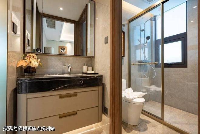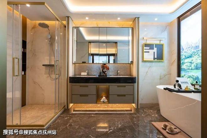 卫生间甄选唯宝的台下盆、汉斯格雅的龙头+恒温花酒,玫瑰岛的淋浴房,科勒的智能一体马桶+浴缸+浴缸龙头等,生活质感肉眼可见。